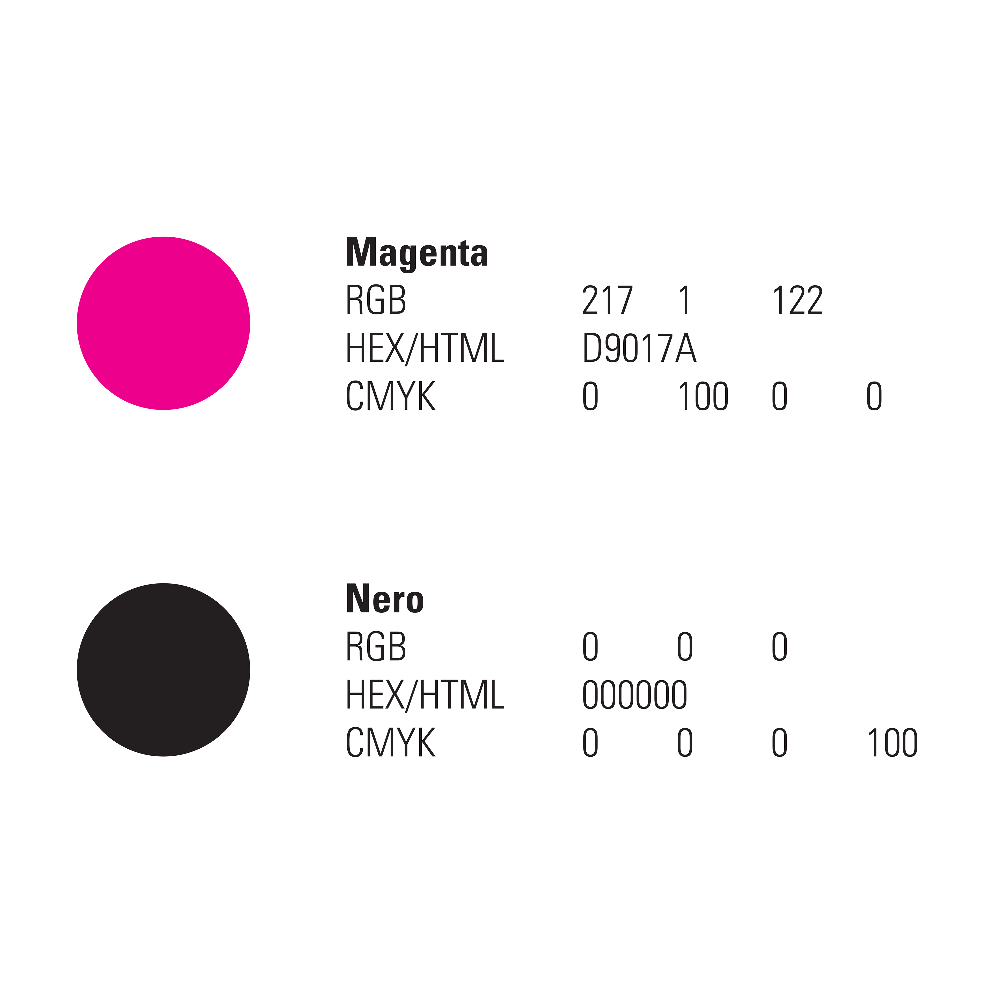 I colori utilizzati sono due: magenta e nero nella versione piena. Il bianco è usato per sfondare le composizioni in campo negativo.